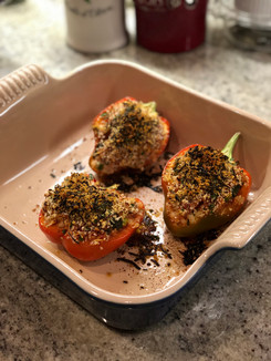 Simply Stuffed Peppers are so easy to make and can take on varying forms of flavor. I did a stuffing that was precooked so that the flavors meld together and marry. Also, I used ground chicken (which I ground myself in the food processor *GASP*). I also cut the peppers in half vertically to get more surface area and make stuffing that much easier to fill.. plus it makes them look so pretty on the plate! I love making this because I can create the stuffing in advance and then pile it into the pepper, bake, and call it dinner in no time! I also have a package, or two, frozen for a week when I just do not feel like cooking.