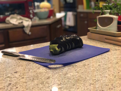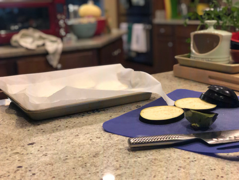 Eggplant is high in water content. In fact, the best way to choose an eggplant at the store is to hold it up to your ear like a Cong and tap it to hear the deep thunk it should make when ripe. However, with the high water content also comes some bitter side effects. Many recipes call for salting each side of the eggplant prior to use. I follow this suggestion depending on what I am making...and how much time I have to cook. I tend not to salt when I make Naked Eggplant Parm but I do when roasting and/or frying like when I make the Neo-Traditional Eggplant Parm.